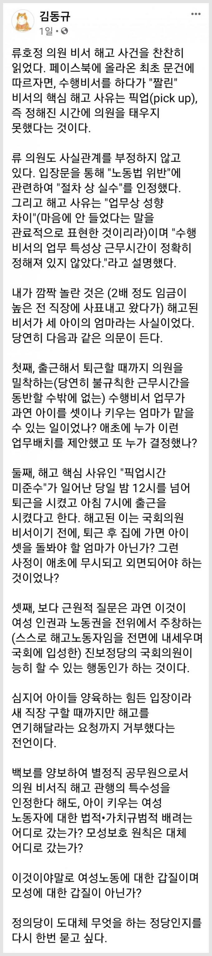 류호정 수행비서 - ë¨ë åë¹ì ë¥í¸ì ê³¼ ëí" ê¸ì§ ì§ì ê¶ìì ëª¨ìµ ì¶©ê²© íê²½ë·ì»´ / 현재 류호정 의원에게 면직당한 전 수행비서가 류호정은 부당 해고 가해자고 문제 해결은 안 됐다라고 주장해서 논란이 이어지고 있습니다.최근 언론에 따르면.. 수행비서 면직 논란 사태 류호정 의원, 공식 입장 밝혀. 잡담 이준석과 류호정 엮지 마라.류호정은 김어준과 딱이다. See more of 류호정 on facebook. 류호정 정의당 의원이 자신의 해고가 부당하다고 주장하는 전 비서 문제와 관련해 스스로 선택한 정치적 행위에 책임을 져야 할 것이라며. 정의당 류호정 국회의원실에서 일하다 면직된 수행비서 a씨가 당 공식 회의에서 류 의원을 '가해자'라 칭하며 공개적으로 문제를 제기한 것으로 알려졌습니다.