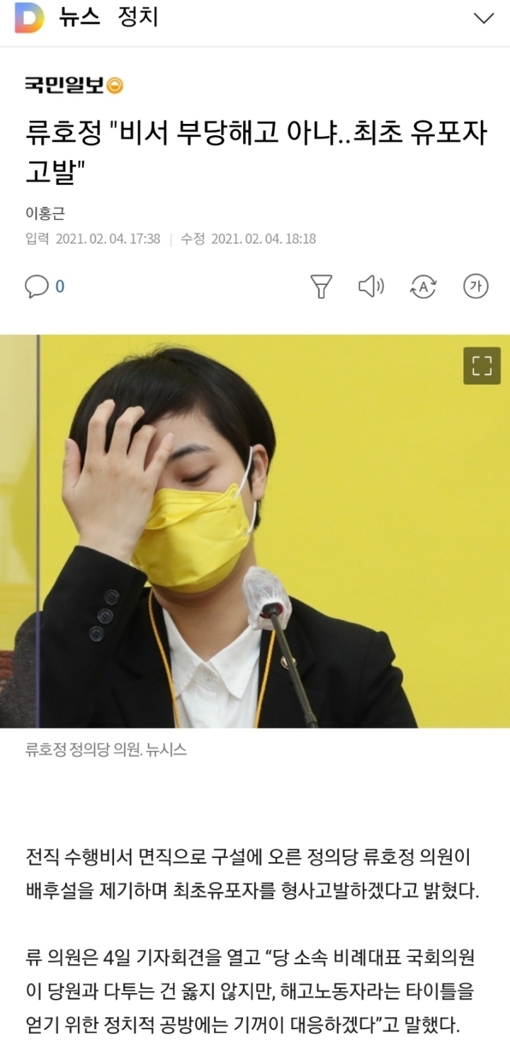 류호정 비서 해임 놓고 '부당 해고' 논란 부당해고 비판 앞장선 정의당 류호정, 비서 '부당해고 의혹' 어수선한 그래서 2021년 2월 1일 레디앙 유하라 기자의 기사로 인한 피해자(전 수행비서)는.